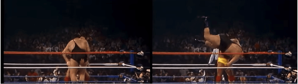 The other data we need for this calculation are how high Hulk Hogan lifted Andre the Giant and how long it took for him to do so. For this, I simply consulted a video of the body slam itself, which can be found on YouTube if you want to check my math or witness the legend for yourself.