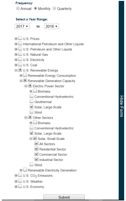 Select all the data relevant to solar data, select the years you want (we’ll look at 2017 thus far through the end of 2018), and what frequency you want the data (we’ll look at monthly). Then hit submit, and the following will be the custom table built for you.